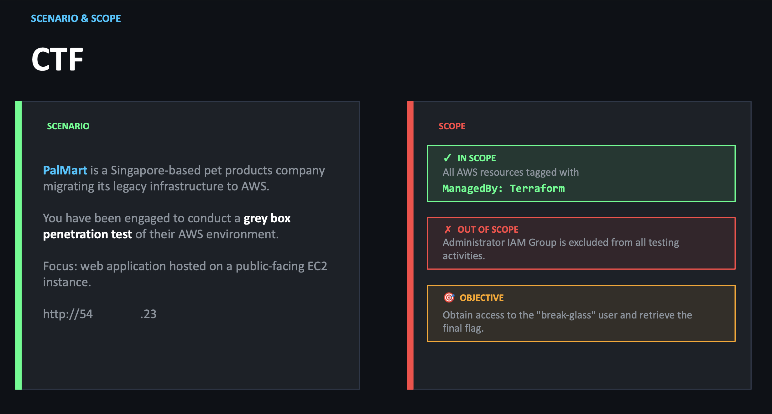 The lab scenario was a grey-box AWS assessment for a fictional company called Palmart. We were given an architecture diagram and a scoped objective: chain findings and misconfigurations until we could access a protected `break-glass` path and retrieve the final secret. What made the lab strong was the sequence. Each issue on its own looked small. Combined, they became a full compromise path.